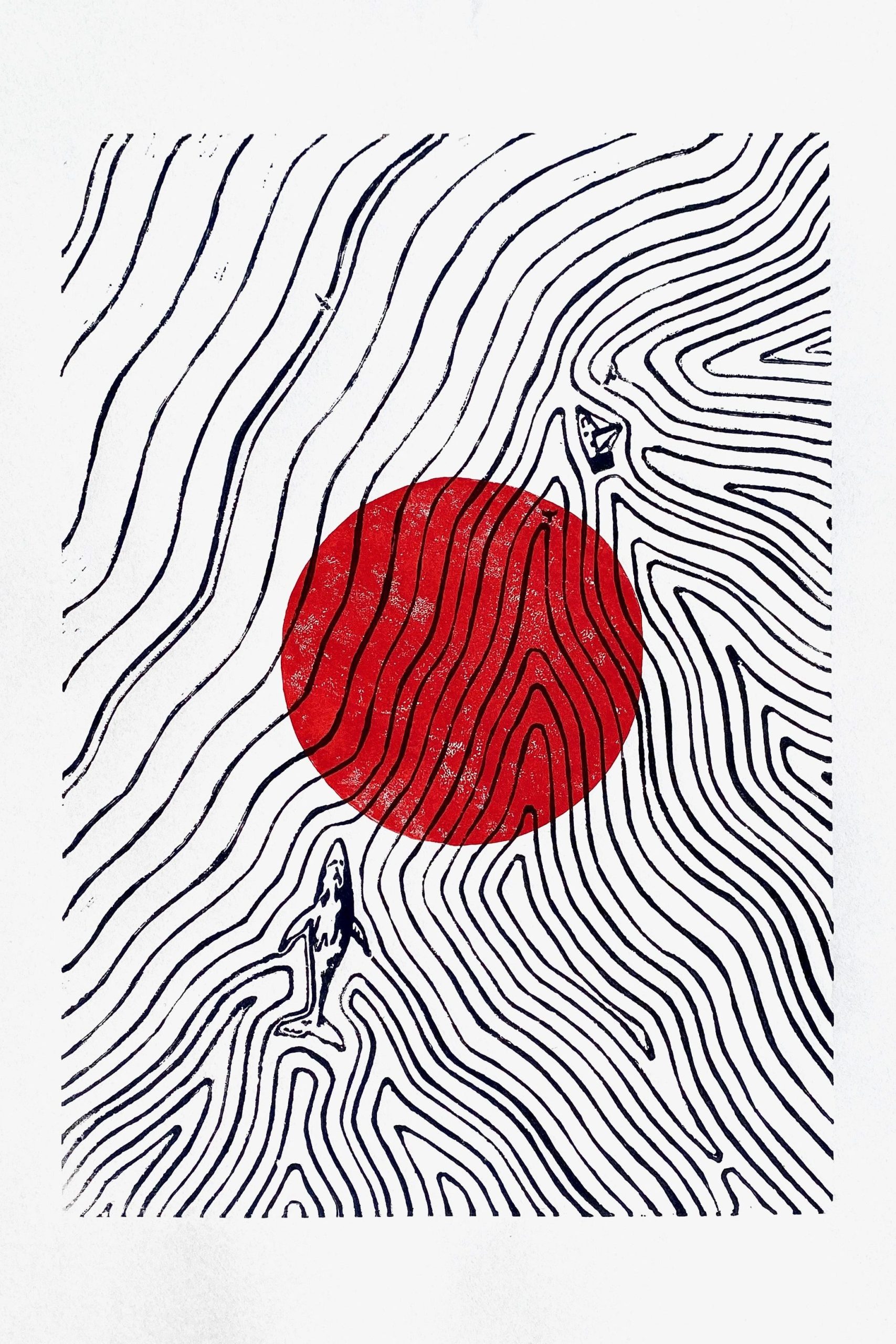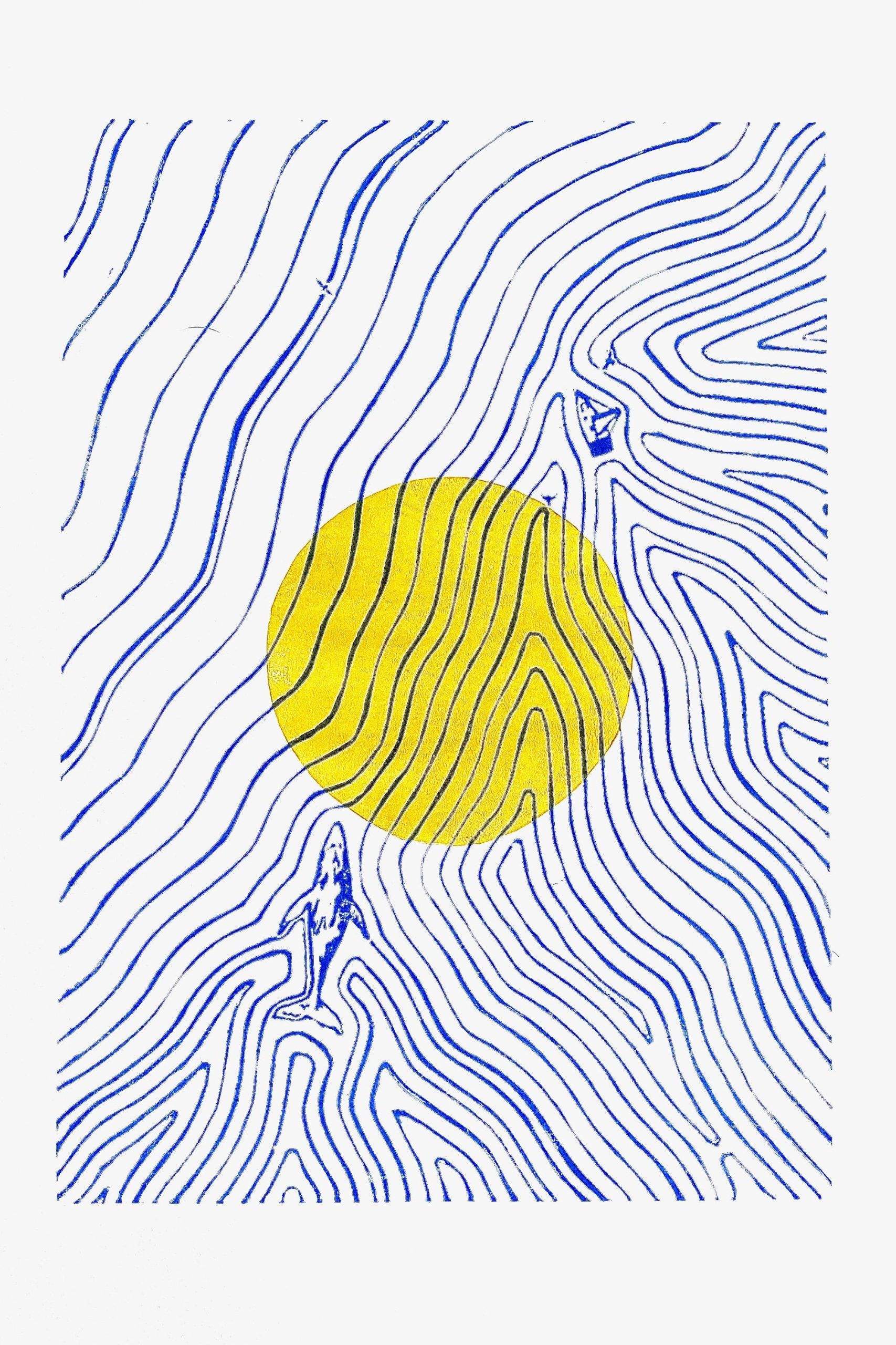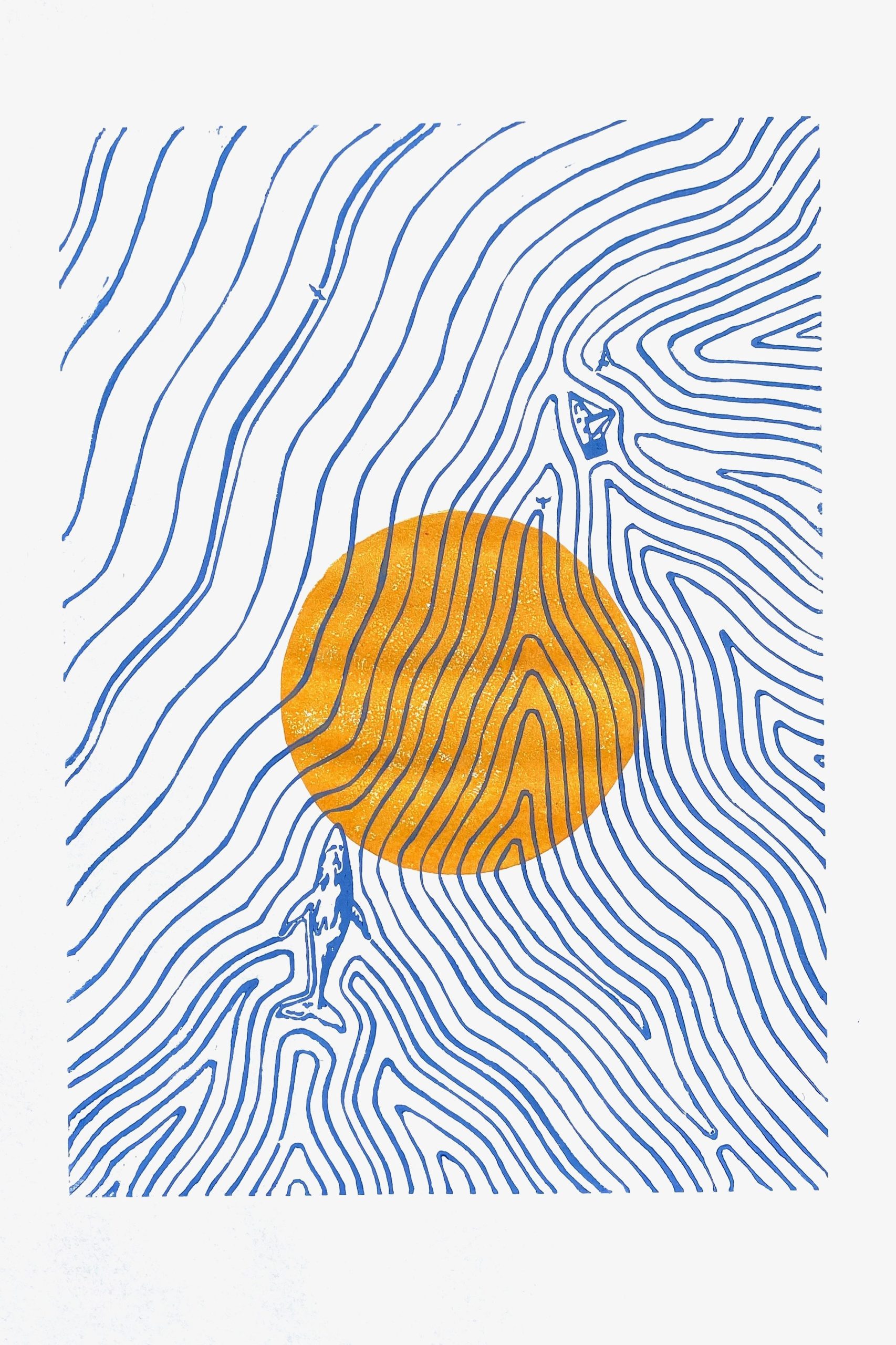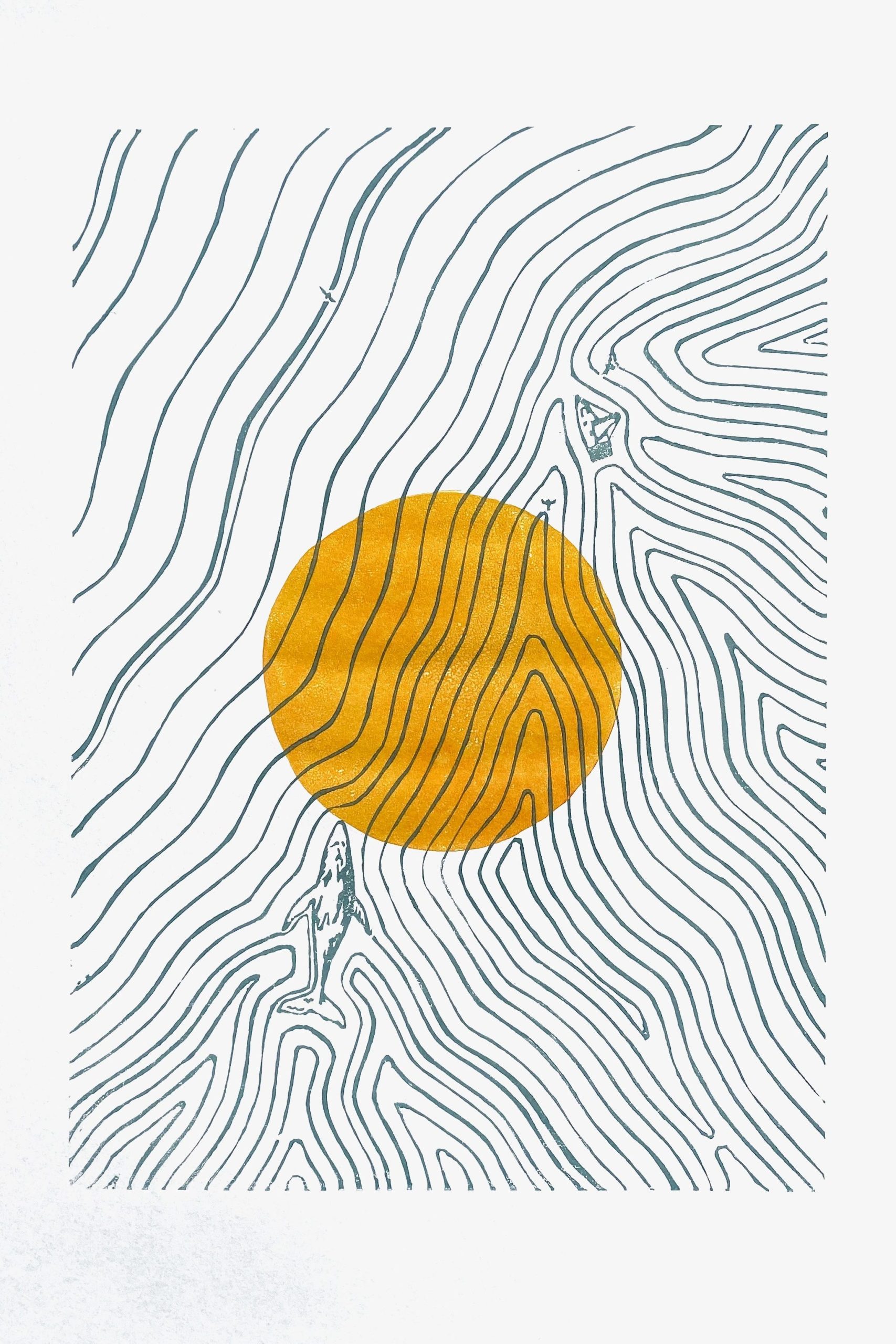 Der Linoldruck bietet die Möglichkeit, das selbe Motiv nur durch das Ändern der Farbe eine andere Geschichte erzählen zu lassen. So geht die Sonne im Meer mal auf, mal unter, oder es wirkt, als hätte das Meer den Mond geschluckt…
